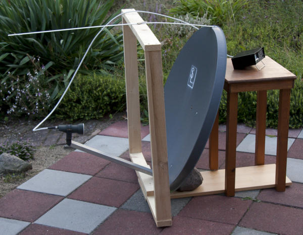 Sat-Spiegel, einem einfachen LNB, etwas Holz und einer Alu-Schiene mit