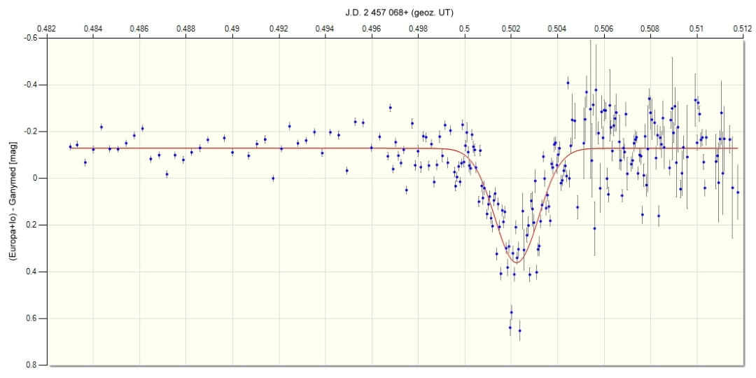 Die Helligkeit von Europa und Io zusammen wurde mit der von Ganymed verglichen. Aus der Lichtkurve konnte die Mitte der Bedeckung für
