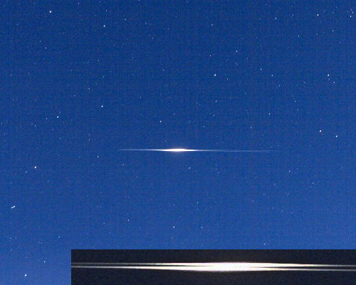 Flugzeugspur zu sehen. Nach der ersten Aufnahme wurden zwei Minuten Pause gemacht, wodurch sich ein kurzer Strich absetzt, der den Start