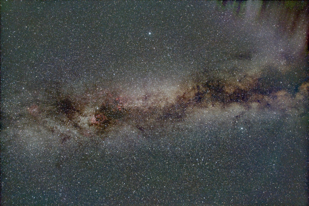 Brennweite und ISO 800, mit parallaktischer Montierung nachgeführt. Addition von 40 Aufnahmen zu je 2 Min. Himmel = 20.5 mag/arcsec².