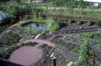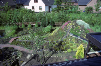 Rasen, nur Heide und Begleitpflanzen, einen Teich und