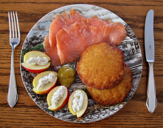 Rotlachs aus der Küstenregion vor Alaska. Die Reibekuchen habe ich
