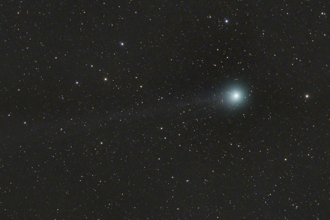 Der Komet zeigt links einen zarten und schmalen Gasschweif. Seine grünblaue Farbe stammt von Emissionslinien und deutet daraufhin, dass er