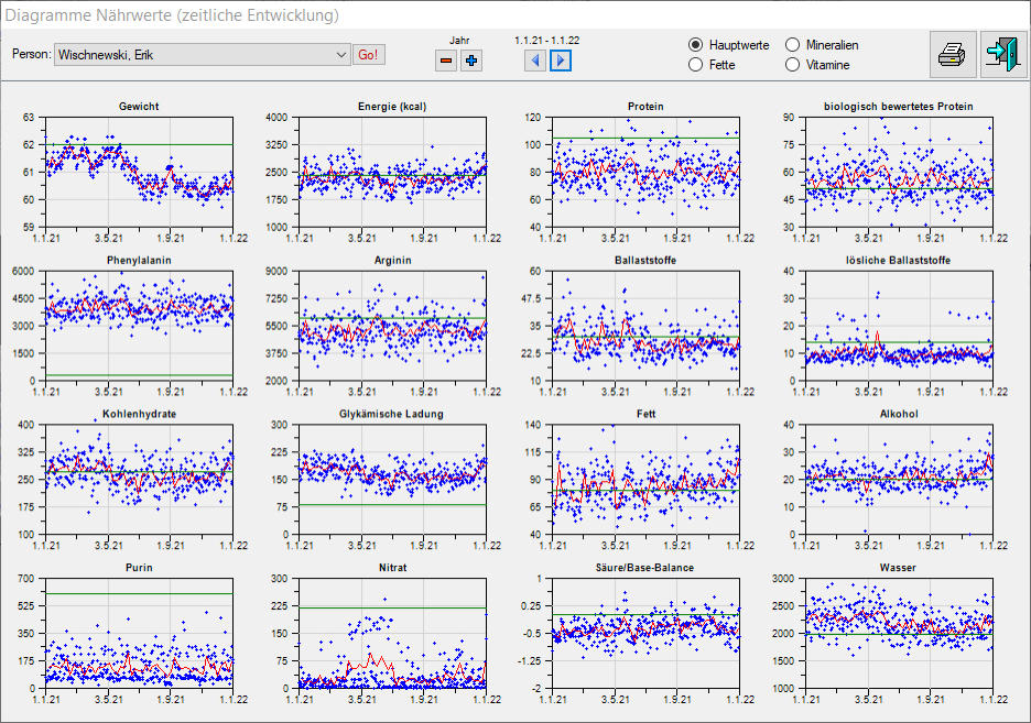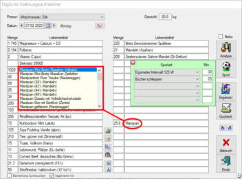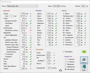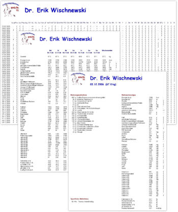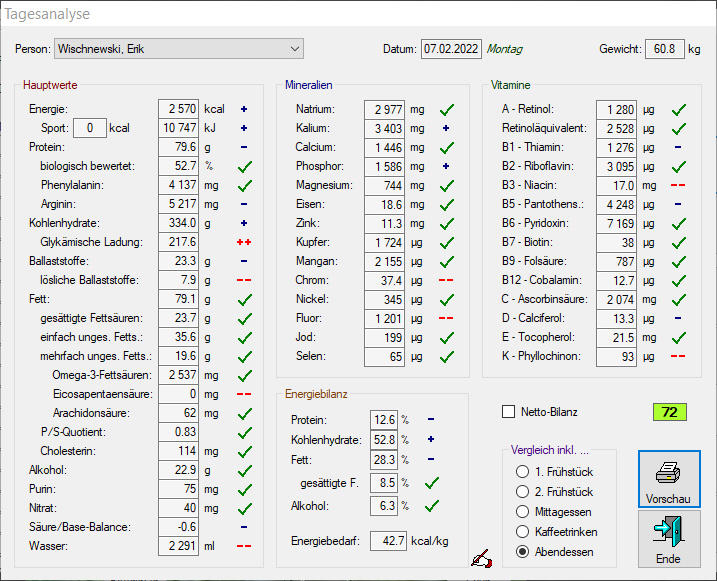 Sport = –100 kcal). Auf dem Ausdruck der Tagesanlyse vermerke ich